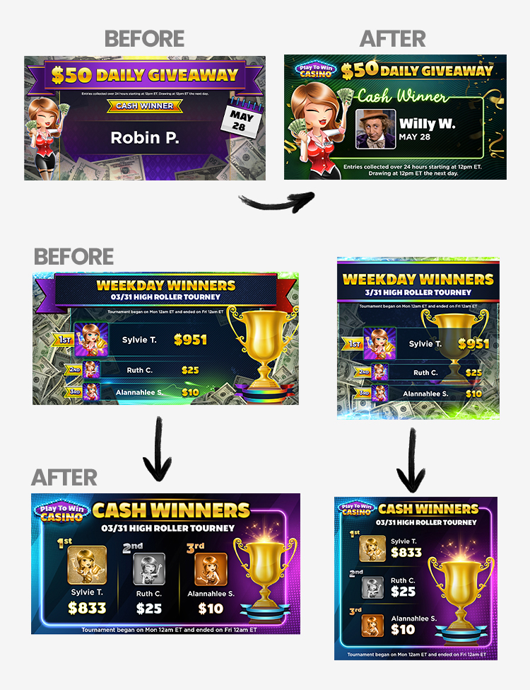 This contract engagement focused on elevating the overall user experience of the Play to Win Casino App through an extensive refresh of in-app creative assets, weekly promotional content, and event visuals. Additional work supported the company’s YouTube channel, contributing to more than 20,000 new subscribers and expanding the brand’s reach beyond the app. The project centered on improving consistency, strengthening engagement, and aligning creative assets with evolving product needs.